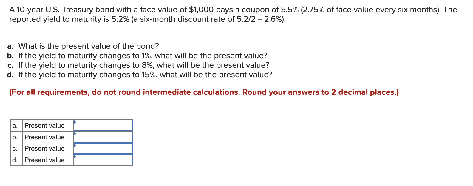 Understanding Treasury Bond Interest Rates | Bankrate What do Treasury bonds pay? Imagine a 30-year U.S. Treasury Bond is paying around a 1.25 percent coupon rate. That means the bond will pay $12.50 per year for every $1,000 in face value (par value)... Solved Assume a 10-year Treasury bond has a coupon rate of ... Transcribed image text: Assume a 10-year Treasury bond has a coupon rate of 5.7%. a. Give examples of required rates of return that would make the bond sell at a discount, at a premium, and at par b. If this bond's par value is $10,000, calculate the differing values for this bond given the required rates you choose in part a.< a. TMUBMUSD10Y | U.S. 10 Year Treasury Note Overview ... 10-year Treasury yield down 6 basis points at 2.767% Apr. 26, 2022 at 8:32 a.m. ET by MarketWatch Bond yields tumble as investors sought safety Yield Calculation for a 10-Year Treasury Note | Sapling Current yield simply is the annual interest amount that a bond pays divided by the current price of the bond. For example, if you buy a bond with a $1,000 face value and an interest rate -- also known as the coupon rate -- of three percent, you'll earn $30 per year in interest. Advertisement