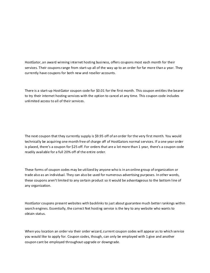HostGator 1 Cent Coupon Code for May 2022 HostGator 1 cent hosting coupon code works for this hosting package too and you can buy it at 1 cent using HostGator coupon codes. Business plan: ... No. Presently there is no Hostgator coupon code which offers 90% discount for longer period like 1 year or 3 years. Usually on Cyber Monday or Black Friday, they offer their biggest deals such as ...