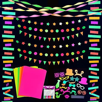 UNIIDECO Over 70 Pieces Glow In The Dark Party Supplies, Neon Paper Decorations, Candyland Birthday Kit, Euphoria Black Light Blacklight Room Decor, ...
